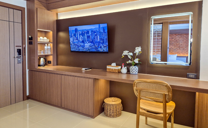 Luxurious furniture in both the spacious living room and the comfortable bedroom, offer up to 3 persons (2 adults and 1 child) enough space to enjoy their stay in Phitsanulok. A Minibar, LED TV, Electric kettle and our unique LED Lighted mirrors complete the perfect amenities setup for any stay.